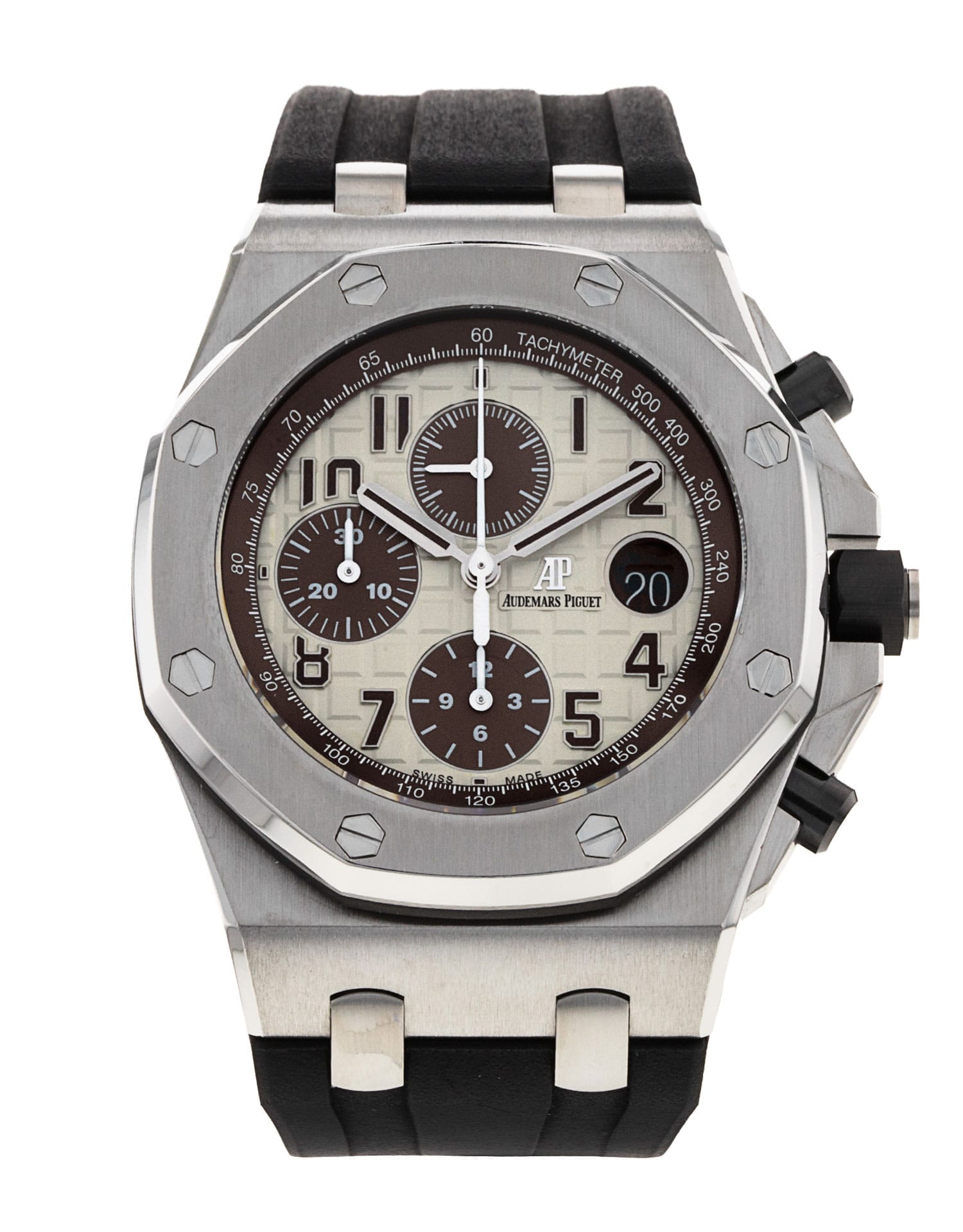 Cette Audemars Piguet Royal Oak Offshore 26470ST.OO.A801CR.01 a un cadran de ivoire arabe et un bracelet en caoutchouc. La précision, le bon fonctionnement et l'état de cette Audemars Piguet ont été minutieusement inspectés dans notre centre de réparation Audemars Piguet certifié afin de déterminer le degré de remise en état requis pour répondre à nos normes strictes. Elle a également été comparée à nos archives afin de garantir son authenticité. Pour votre tranquillité d'esprit, toutes nos montres s'accompagnent d'une garantie de 24 mois.