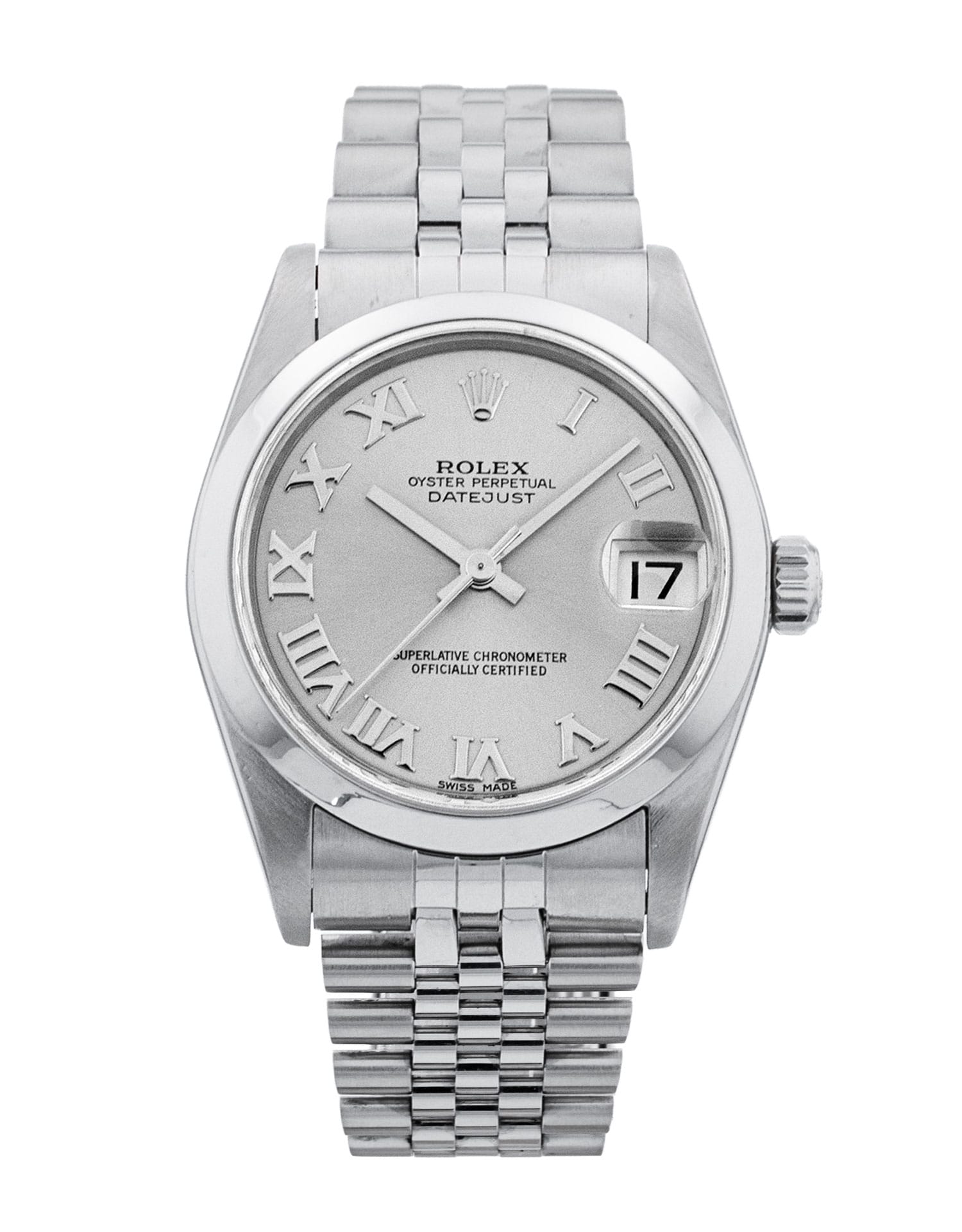 Cette Rolex Mid-Size Datejust 78240 a un cadran de argent à chiffres romains et un bracelet en bracelet. L'imperméabilité, la précision, le bon fonctionnement et l'état de cette Rolex ont été minutieusement inspectés afin de déterminer le degré de remise en état requis pour répondre à nos normes strictes. Nous avons également étudié sa documentation technique et les archives du fabricant, quand cela s'est avéré possible, afin de garantir l'authenticité de la montre et son passé irréprochable. Pour votre tranquillité d'esprit, toutes nos montres s'accompagnent d'une garantie de 24 mois. L’un de nos techniciens spécialisés dans le polissage a éliminé les marques d’usure quotidienne sur le boîtier et le bracelet de cette montre. Par conséquent, cette montre n’est pas couverte par la garantie restante du fabricant.