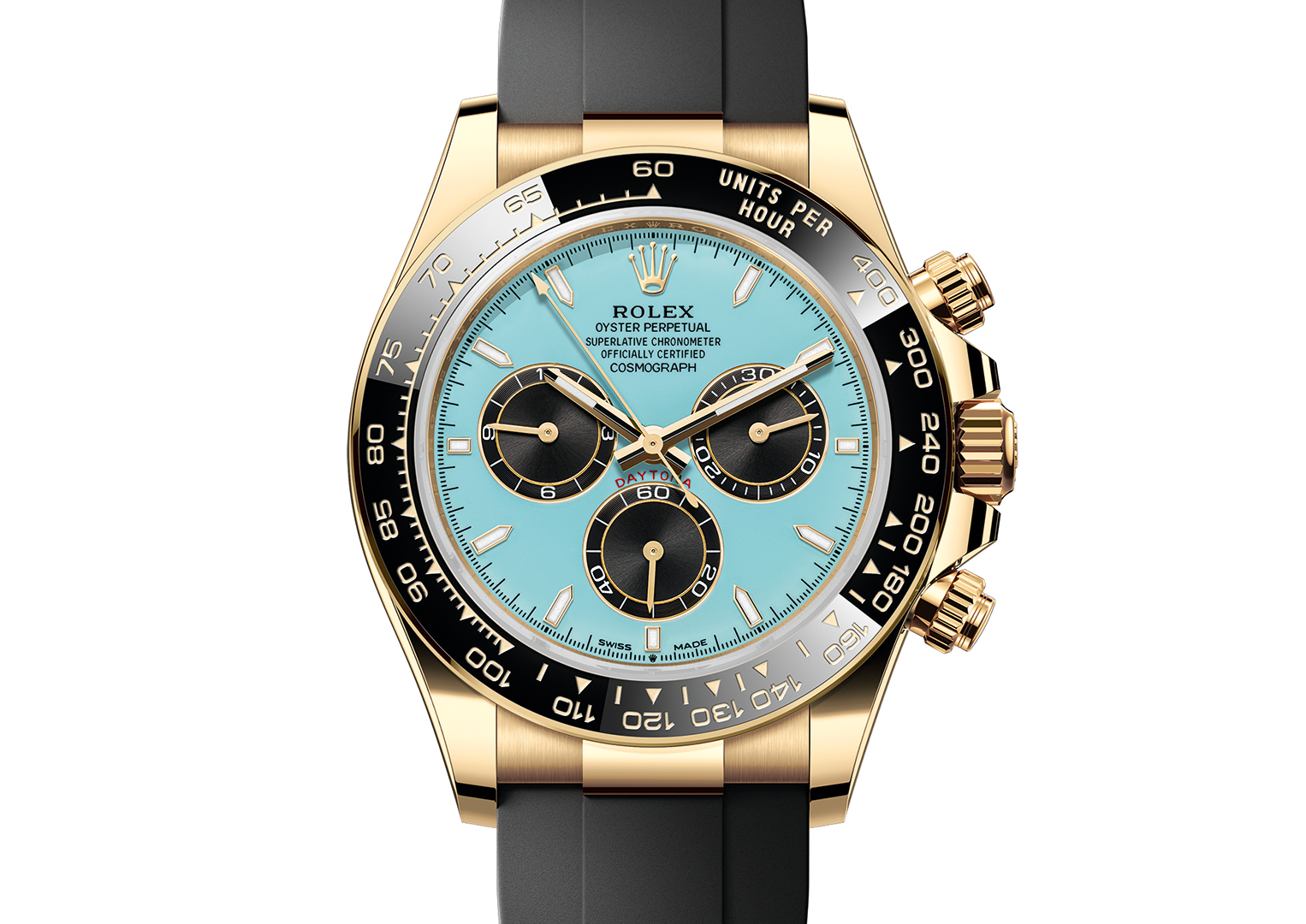Parmi les meilleures nouvelles Rolex présentées au salon Watches & Wonders 2025, nous sommes tombés sous le charme de cette Daytona avec son cadran laqué bleu turquoise. Cette montre de toute beauté est d’ailleurs maintenant surnommée « l’Alcaraz », après avoir été portée par le célèbre joueur de tennis, Carlos Alcaraz, lors de la finale de Roland Garros 2025. Nous adorons le contraste saisissant entre son boîtier en or jaune, son cadran bleu et ses sous-cadrans et sa lunette en céramique noirs. Elle est équipée du calibre maison 4131 et montée sur un bracelet noir en caoutchouc Oysterflex.