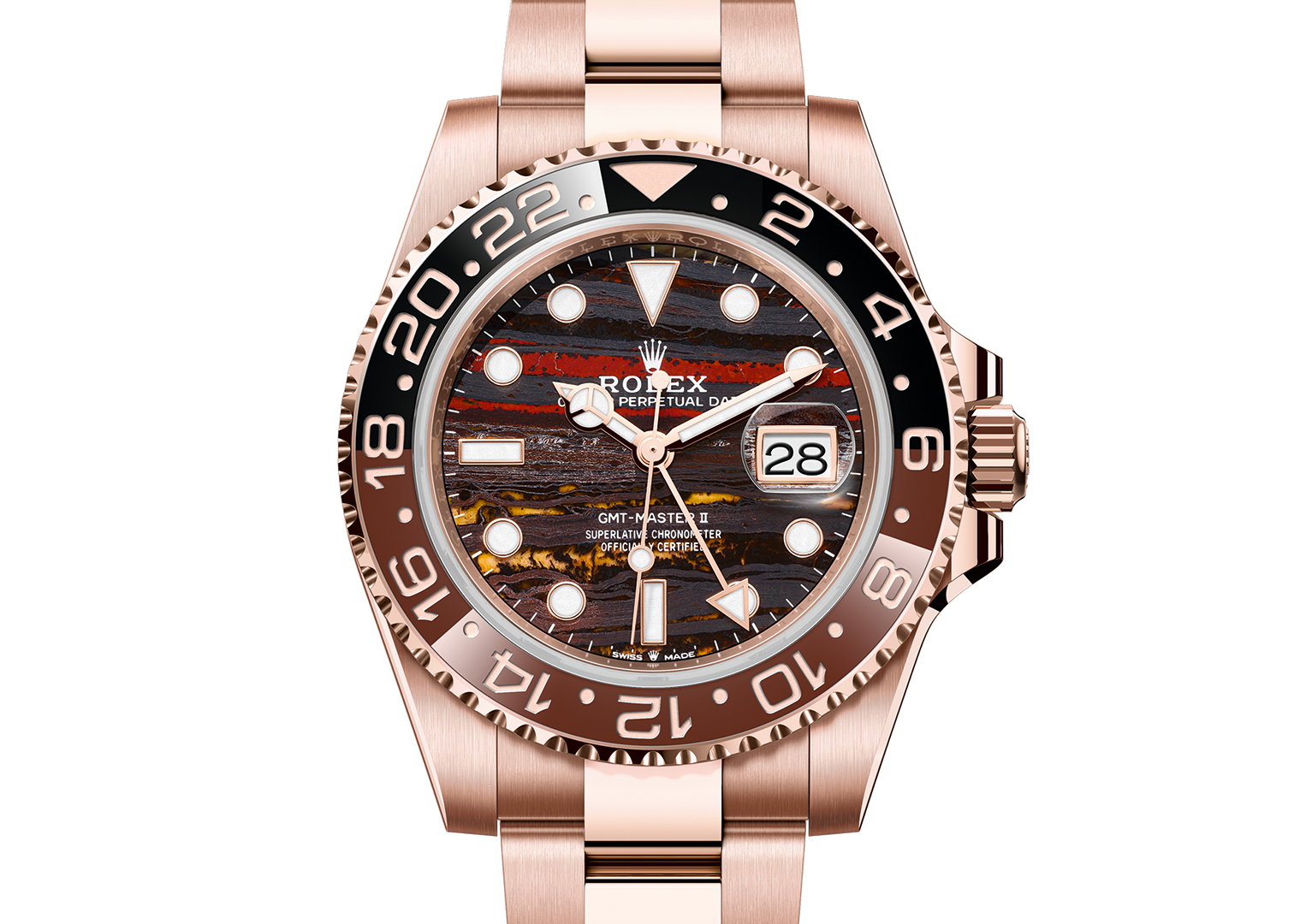 Chez Rolex, les grands anniversaires passent rarement inaperçus et pour les 70 ans de la GMT-Master en 2025, nous nous attendions à ce que la marque sorte un modèle vraiment spécial. Cette GMT-Master II en or rose a été à la hauteur de l’évènement avec son cadran époustouflant en roche métamorphique, unique à chaque pièce comme pour les cadrans en météorite. Présente pour la première fois dans la collection GMT, cette montre légendaire à double fuseau horaire arbore une toute nouvelle esthétique qui rappelle la lave en fusion, les couchers de soleil du Moyen-Orient et les rayures du pelage des tigres. Elle est aussi disponible en or jaune sur un bracelet Jubilee.